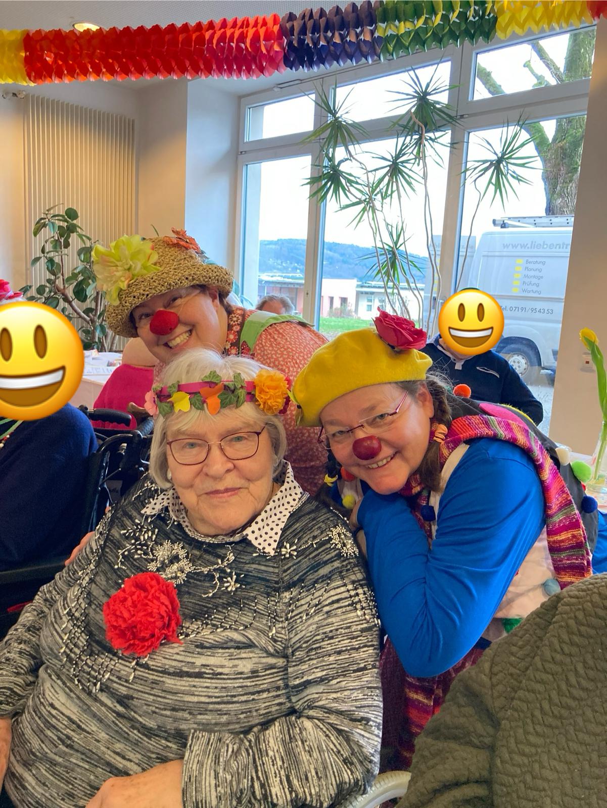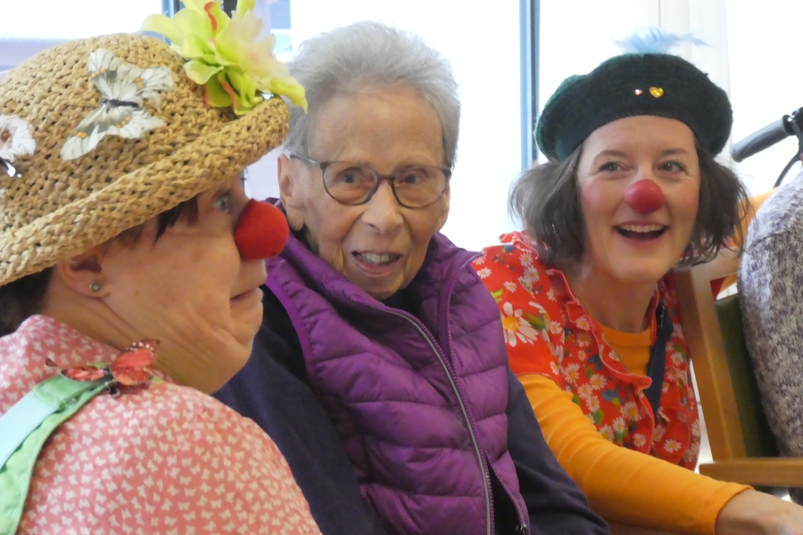 Ein Bewohner ist schon lange im Haus und kennt uns. Besonders zu meiner Clownsfreundin Struwwelursel hat er eine besondere Beziehung. Er ist alt und wird jeden Tag etwas müder. Er spricht nur noch selten und ganz leise. Sie kniet sich auf Augenhöhe und ergreift seine Hand. Da schenkt er ihr einen dankbaren Blick, gibt Ihr einen Handkuss und sagt ganz leise: „Wie schön, dass sie da sind.