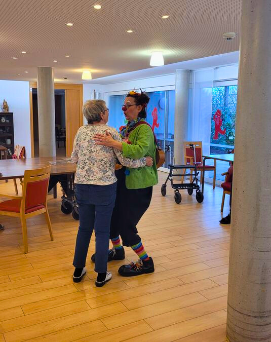 Visiten in Pflegeeinrichtungen und Demenz-Stationen sind den dort lebenden Menschen angepasst. Wir gestalten Besuche nach Bedarf ruhiger und wenn nötig verlangsamt. Unsere Clowns kennen die Bewohnerinnen und Bewohner oft seit Jahren, wissen über Ihre Biografie Bescheid und begegnen Ihnen auf Augenhöhe. Das schafft Vertrauen und Sicherheit in der Situation mit verlangsamter Wahrnehmung und nachlassender Erinnerung. Herzensarbeit pur! Lieder aus vergangenen Tagen, Feste die gefeiert wurden und auch die Liebe sind zentrale Punkte in den Begegnungen und ganz oft Tür- und „Erinnerungsöffner“. Über den großen Erfahrungsschatz unserer Seniorinnen und Senioren staunen unsere Clowns oft. Und manchmal lernen Sie sogar noch was dazu. Zum Beispiel wie man einen „Schieber“ tanzt (heute würde man es Stehblues nennen)
