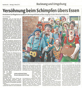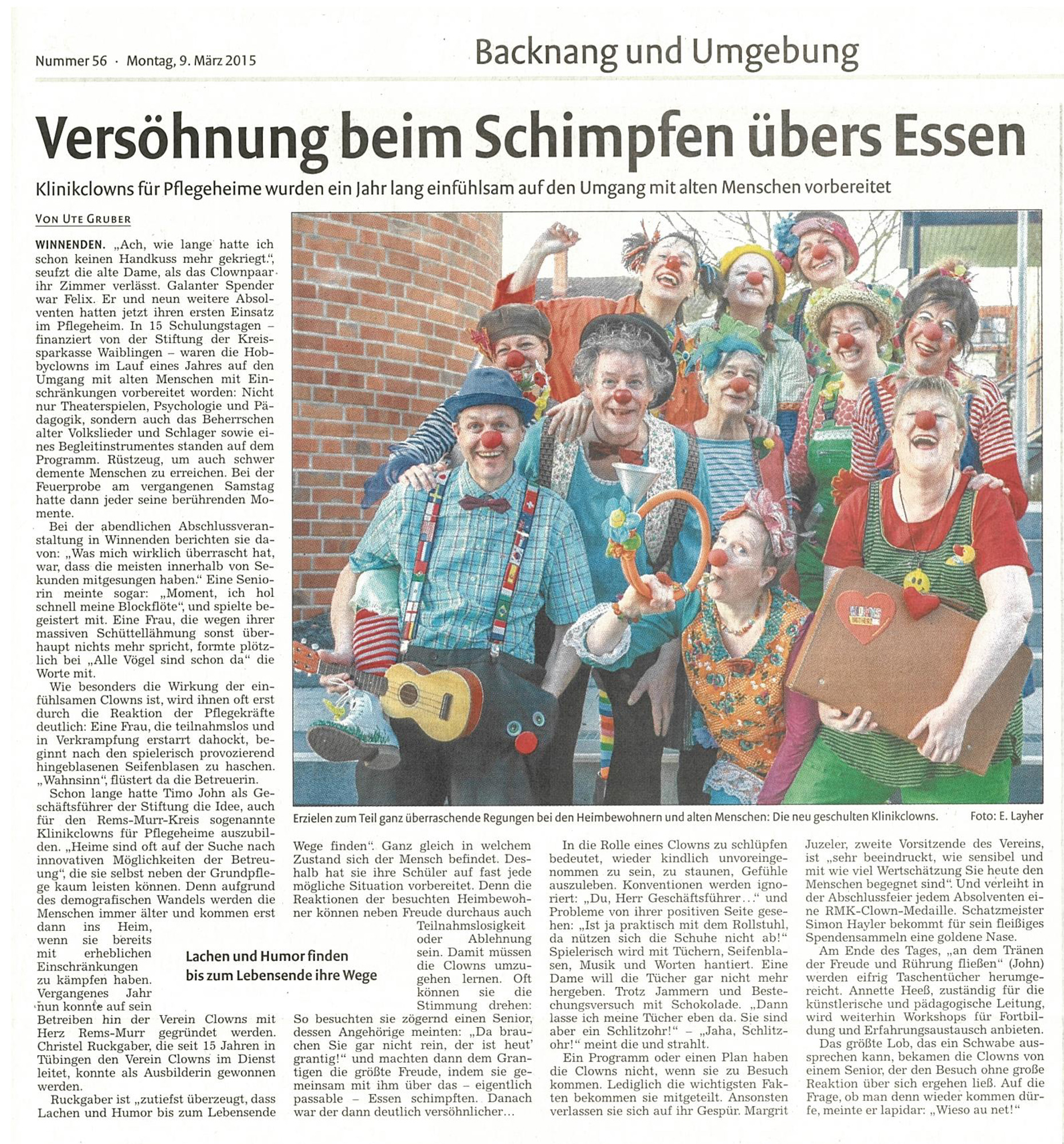 einfühlsame Stil der Clowns von Bedeutung. Die Clowns gehen auf die individuellen Befindlichkeiten der Senioren ein, sprechen, spielen, zaubern, singen, musizieren und lachen mit ihnen und machen damit ihren oft etwas eintönigen und einsamen Heimalltag bunter. In diesem Zusammenhang wurde im vergangen Jahr unser der Verein "Clowns mit Herz Rems-Murr e. V." gegründet, der nun die zehn neuen Clowns an Pflegheimeinrichtungen vermittelt.