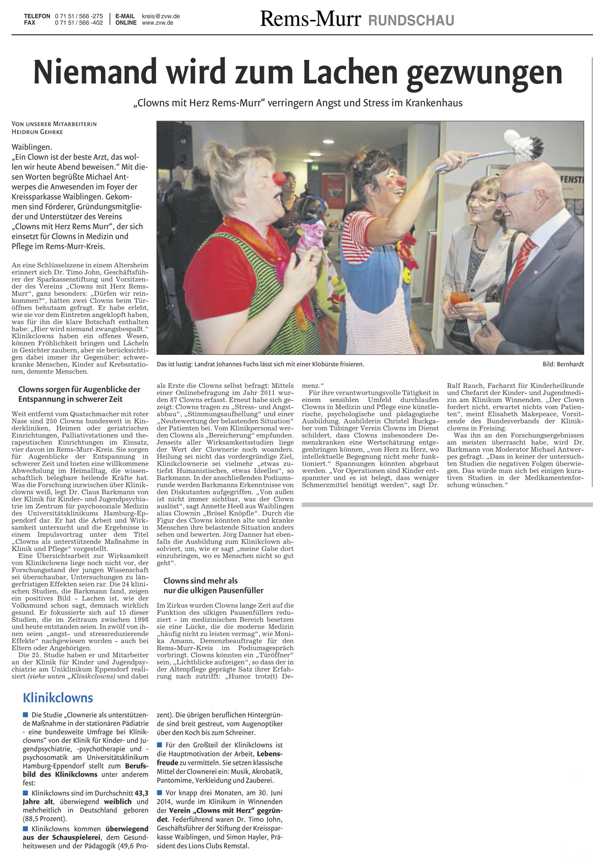 "Clowns mit Herz Rems-Murr" verringern Angst und Stress im Krankenhaus. Ein Clown ist der beste Arzt, das wollen wir heute Abend beweisen. Mit diesen Worten bgrüßt Michael Antwerpes die Anwesenden im Foyer der Kreissparkasse Waiblingen. Gekommen sind Förderer, Gründungsmitglieder und Unterstützer des Vereins "Clowns mit Herz Rems-Murr", der sich einsetzt für Clowns in Medizin und Pflege im Rems-Murr-Kreis.