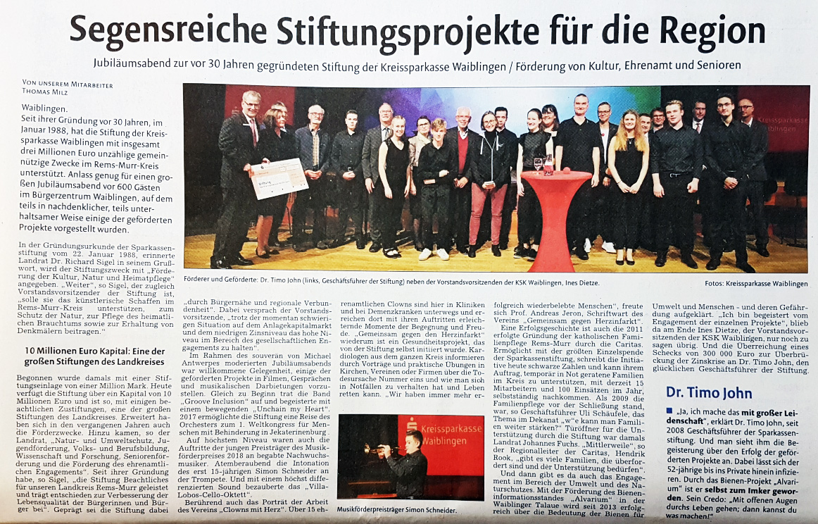 Jubiläumsabend zur vor 30 Jahren gegründeten Stiftung der Kreissparkasse Waiblingen / Förderung von Kultur, Ehrenamt und Senioren.