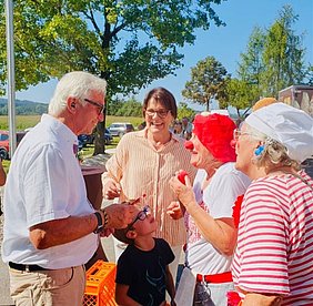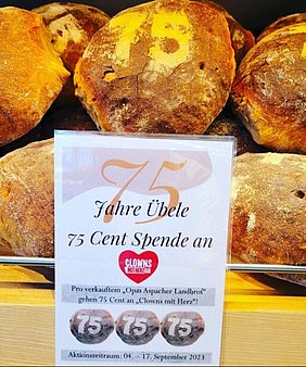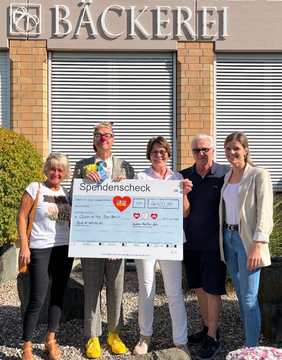 Da feierten wir kräftig mit, denn von jedem verkauften "Opas Aspacher Landbrot" flossen 75 Cent in unsere Arbeit in Kinderklinik und Pflegeheimen. So kamen am Ende unglaubliche 4.300,-€ als Spendensumme zusammen. Familie Übele übergaben unserem Brokkoli und "Miss Moneypenny" (Andrea Wihofszki) den dicken Scheck. Wir sagten ganz herzlich "Tankeschööön..."