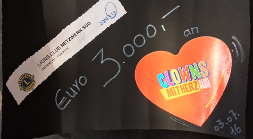 Beide, Martina Vincon (Zone-Chairperson) und Oliver Vincon (Präsident Netzwerk Süd), sind sehr engagiert bei den "Lions". Ihnen ist es ein Anliegen, ihre Freude und ihr Glück nicht nur zu feiern, sondern auch zu teilen! So kamen sagenhafte 3.000 Euro für unseren Verein zusammen, die sie für die Ausbildung drei weiterer Begegnungs-Clowns spenden. Den Scheck überreichten sie Simon Hayler vom Vorstand "Clowns mit Herz".