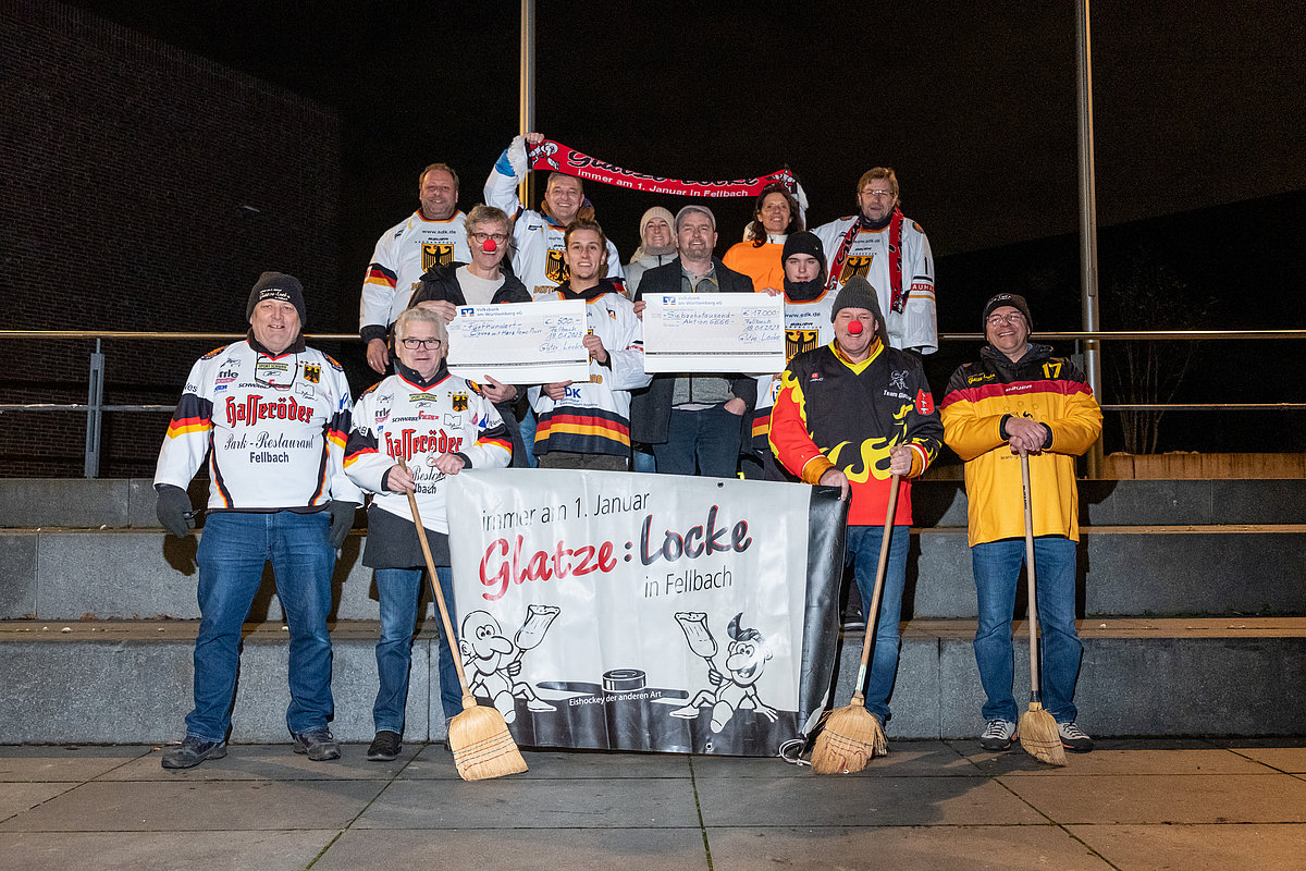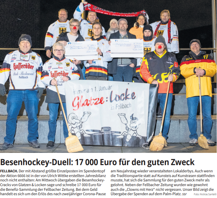 Tankeschööön!!! Für den krassen 500,-€ Scheck für unsere Arbeit. Immer am 1. Januar treten die Glatzen gegen die Locken beim legendären Besenhockey Spiel in Fellbach an. Sieger gibt es dabei viele, denn die Einnahmen kommen gemeinnützigen Vereinen zu Gute. Unter anderem uns. Ne tolle Sache...finden wir.
