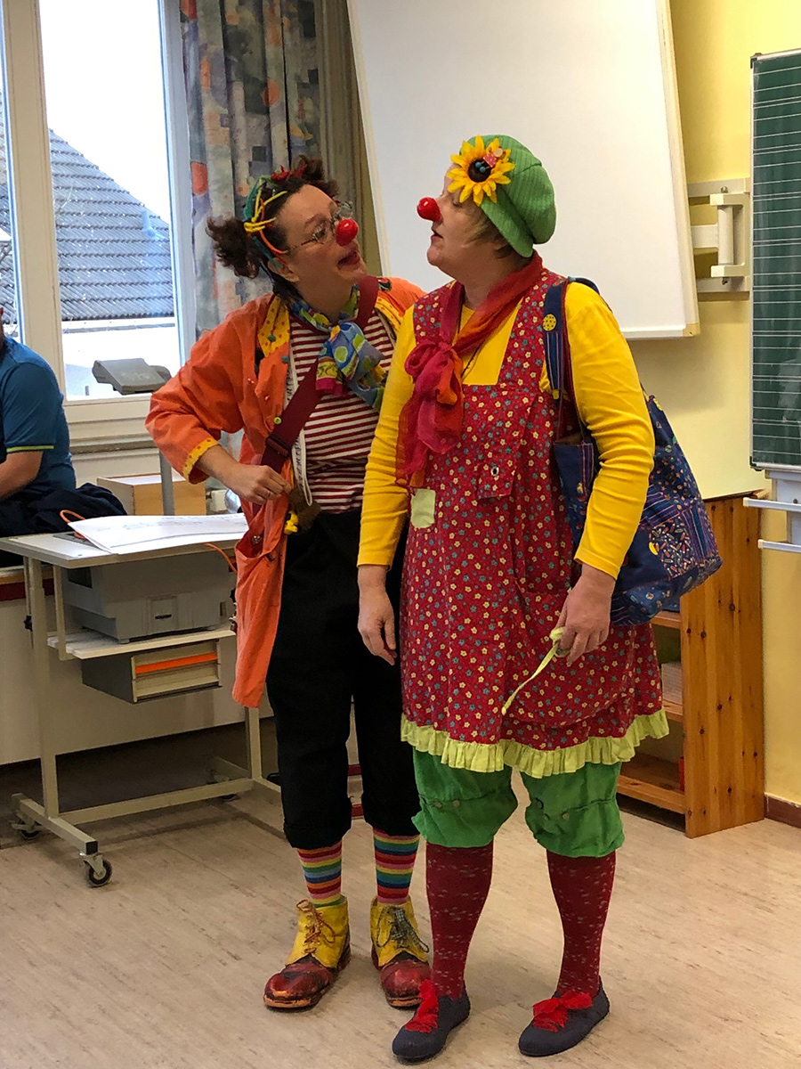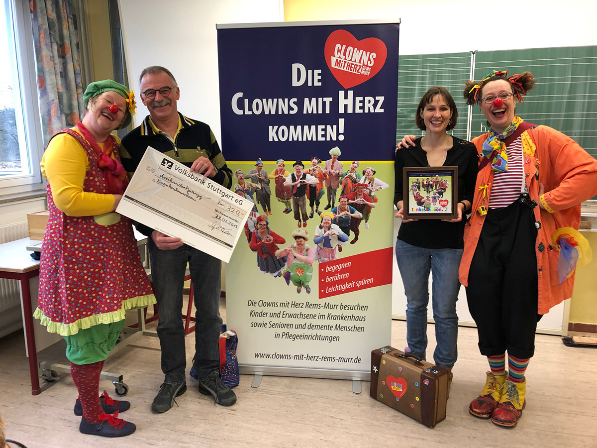 Nach einem kleinen Clown Auftritt wurden die beiden (in Zivil) von den Kindern mit Fragen überschüttet. Vielen Dank auch für die Spende von 320,-€ die durch eine Elternaktion (Pausenverkauf und Spenden Adventsgottesdienst) zusammengekommen sind. Auf dem Bild sind, neben unseren Clowns, zu sehen der Rektor Herr Feess und Elternbeirätin Frau Schuster.