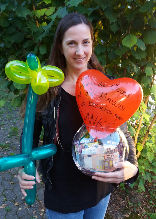 Moni R. hat sich zu ihrem runden Geburtstag nichts anderes von Freunden und Verwandten gewünscht als eine Spende für die Clowns mit Herz. Auf diese schöne Idee kam sie durch Augustine, von der sie sagt, sie sei eine warmherzige und lebensfrohe Frau und eine Clownin mit großem Herz! Es war ihr ein Anliegen unser "tolles, wertvolles Projekt" zu unterstützen. Sie konnte ihre Geburtstagsgäste begrüßen, einen tollen runden Geburtstag feiern und musste lange zählen bis alle Spenden zusammengezählt waren.