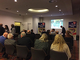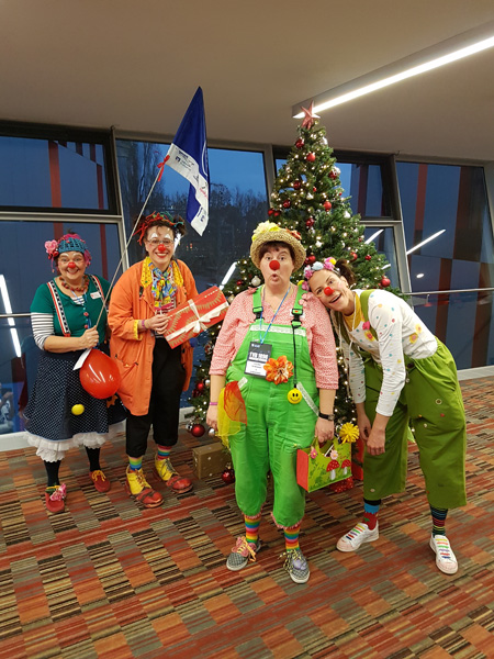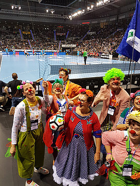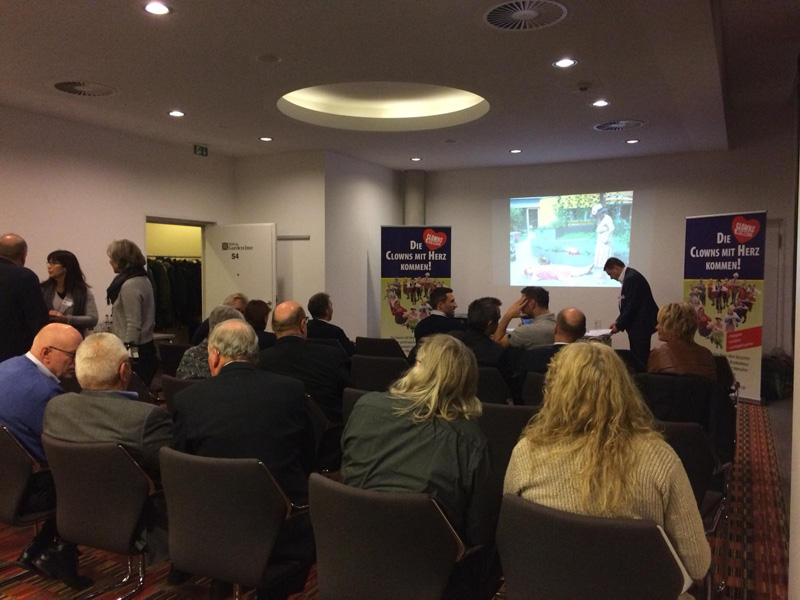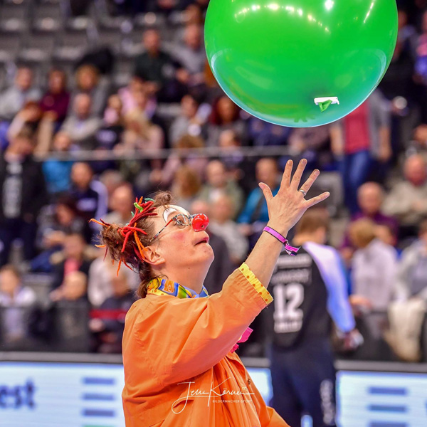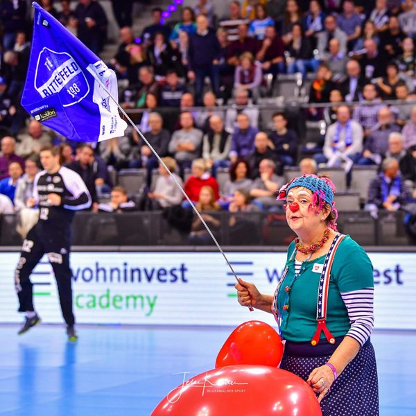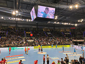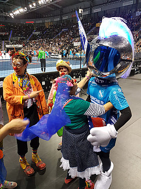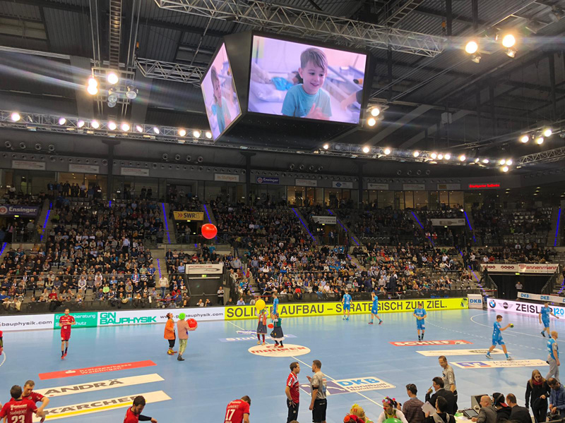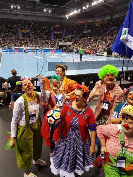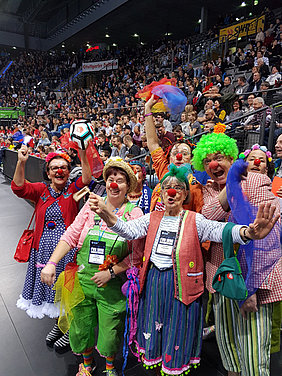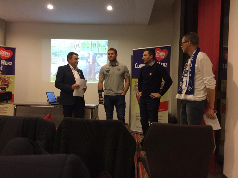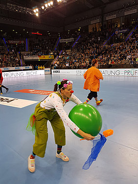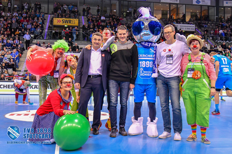 Am 13. Dezember hieß es mal wieder DANKE sagen. Und unserer Einladung folgten wieder viele nette Menschen, die teilweise schon seit der Vereinsgründung an unsere Seite stehen. Toll wurden wir dabei von den Erstliga Handballern des TVB 1898 Stuttgart unterstützt. Räumlichkeiten, Eintrittskarten und sogar für ein kurzes Interview war Zeit. Mimi Kraus und Sven Franzen konnten wir Fragen zum Spiel und den Zukunftsplänen stellen. Natürlich wurden auch unsere Neuigkeiten präsentiert und danach ging's zusammen in die Porsche Arena. Das fast komplettem Clowns Team trainierte in der Halbzeitpause solange am Videowürfel 5.192 Zuschauer unseren Film sahen.