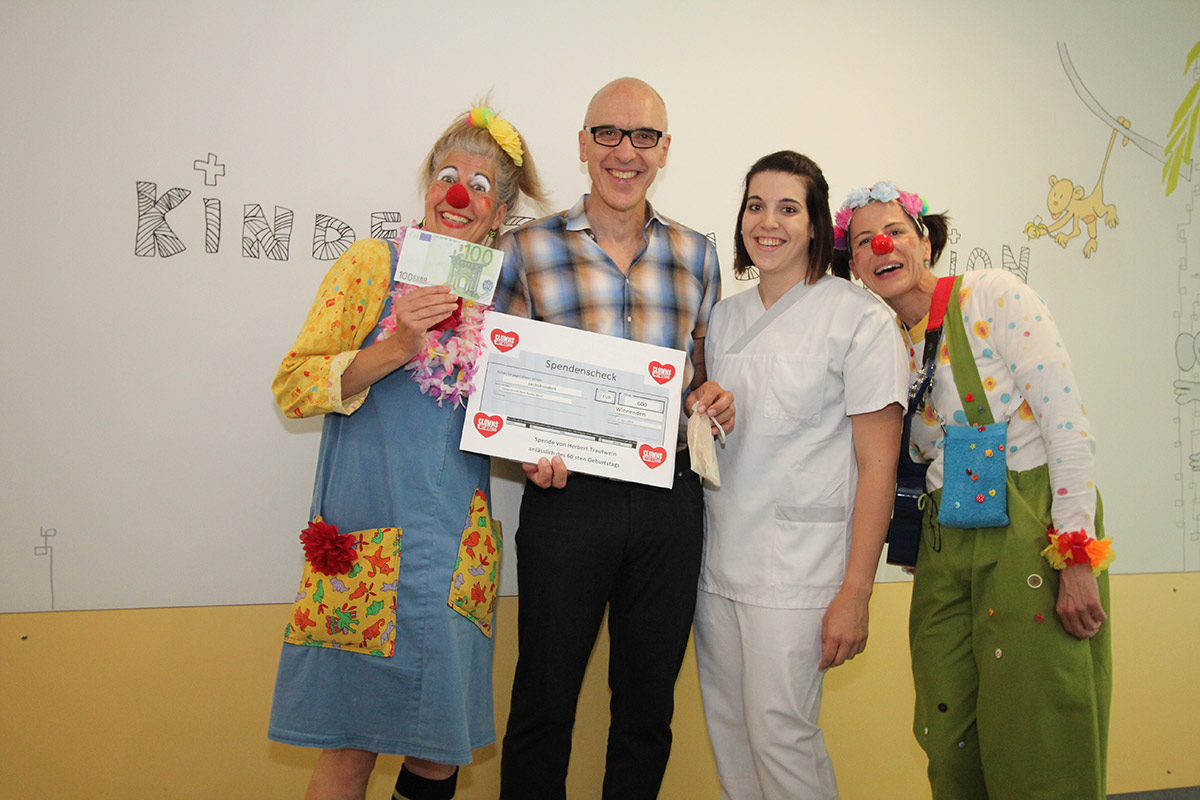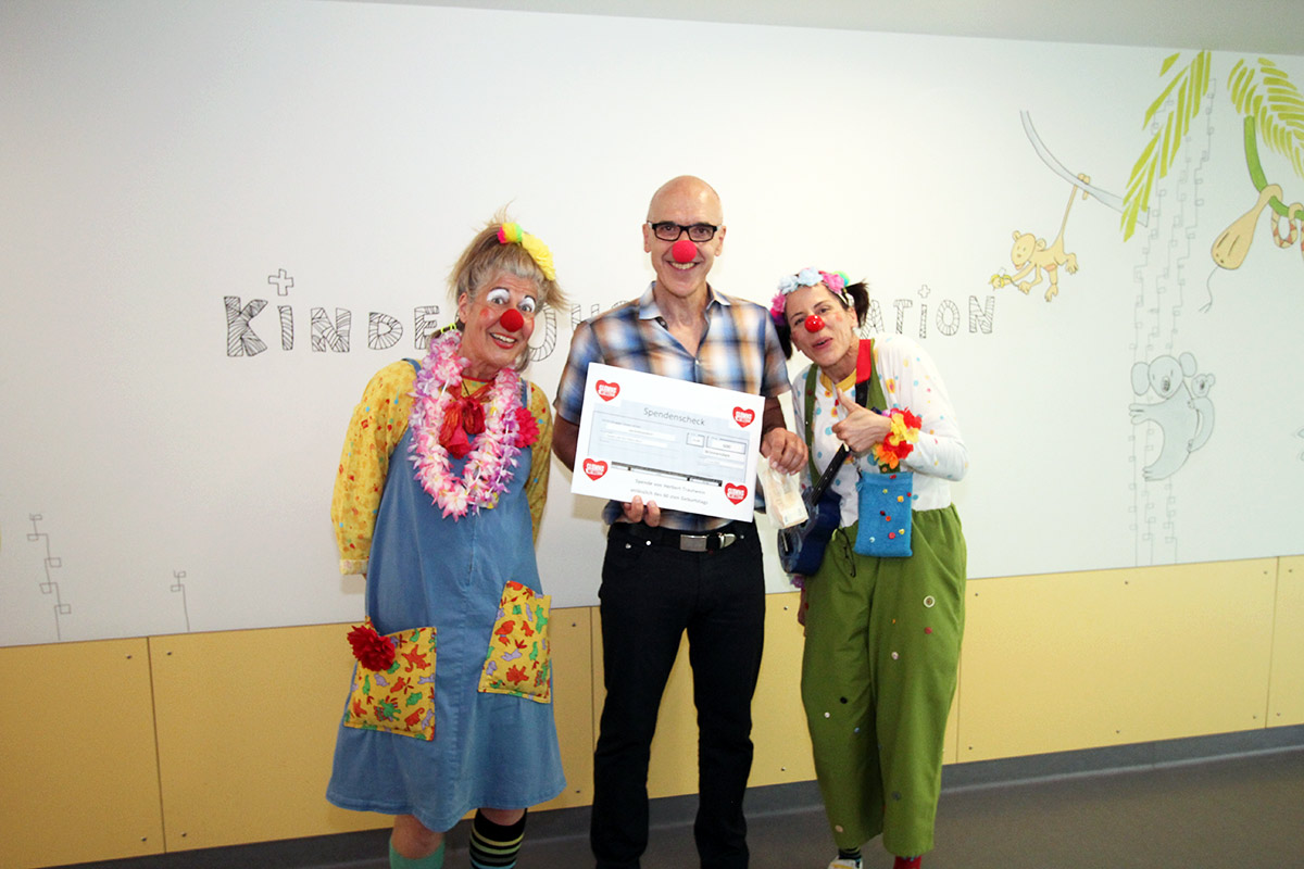Mit einem dicken Scheck über 600,-€ besuchte er in der Winnender Kinderstation unsere beiden Clowns Camilla-Schabernack und Petersilli.